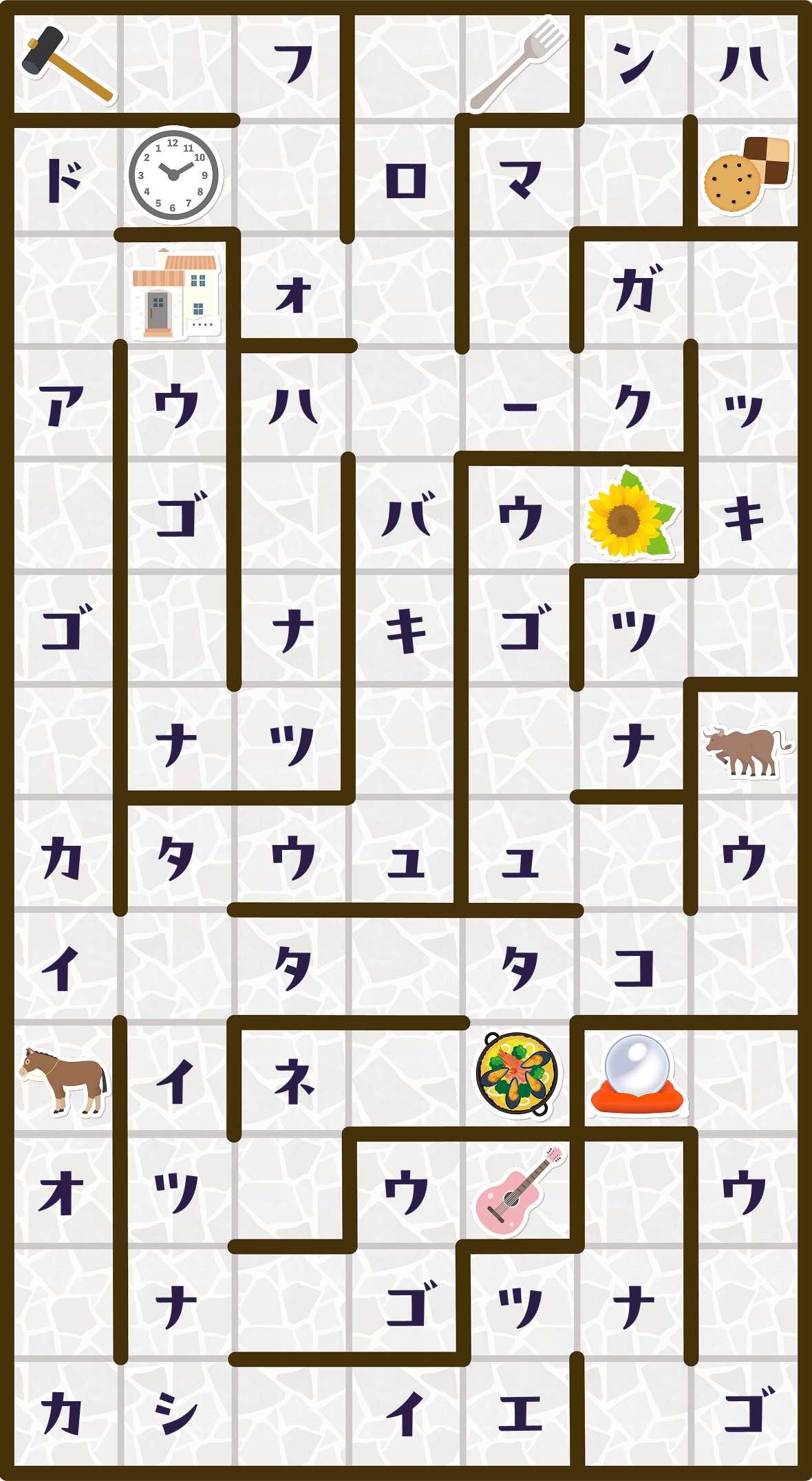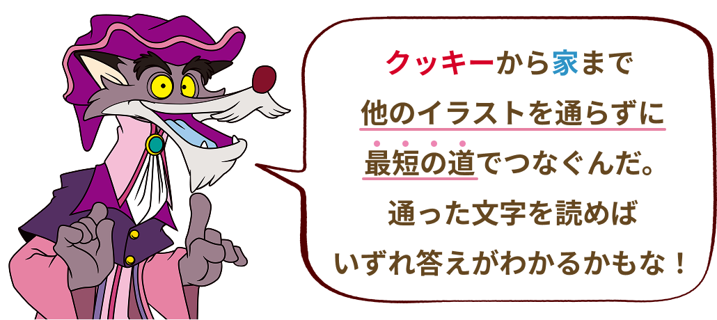 問題文の通りに、「クッキー」と「家」を他のイラストを通らずに最短でつなげてみよう。